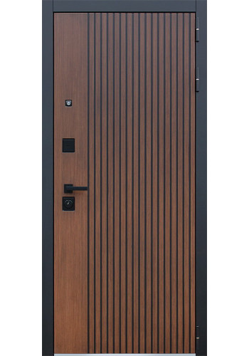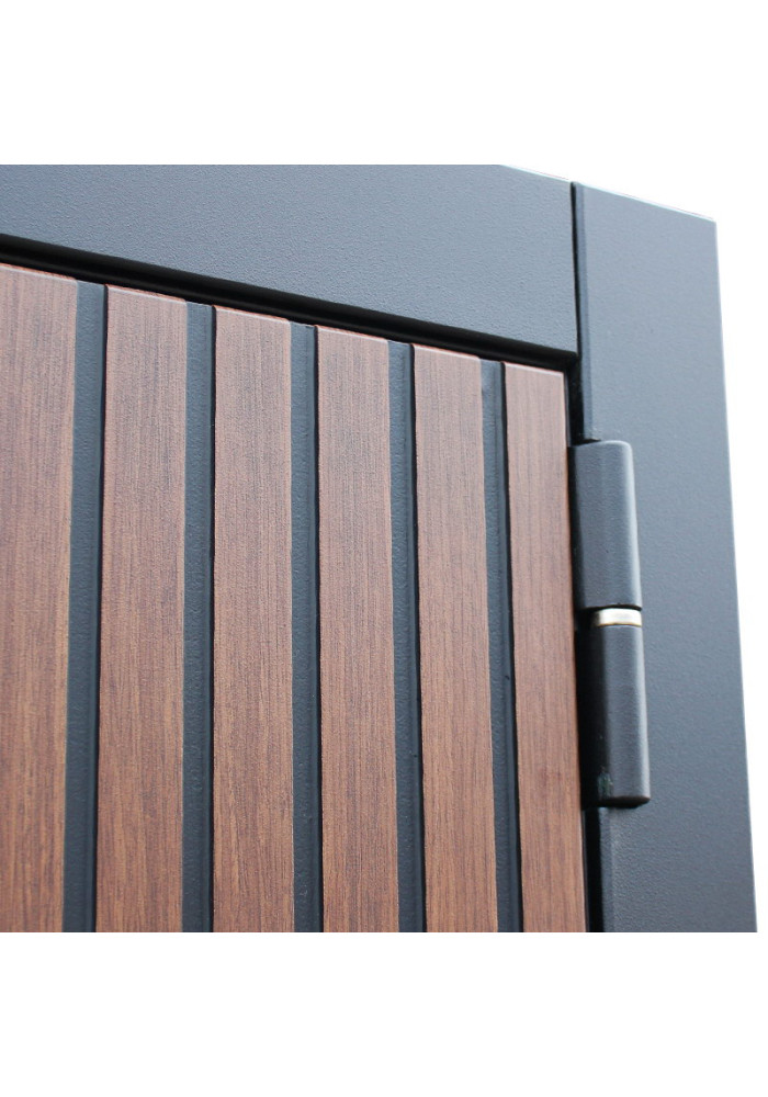 - Наружный лист металла: Лист металла 1,5 мм. Экошпонированная дизайнерская панель МДФ 10 мм. Линейная фрезеровка. Цветовая комбинация: "дуб кантри темный", черное патинирование по фрезеровке. Наличник МДФ гладкий 80 мм., цвет "черный кварц".